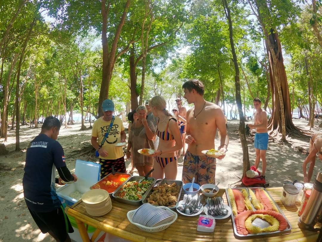 For a tasty Thai buffet lunch under the shady trees. Next, get free time to sunbathe on the sand, swim, and go to the restrooms. Back aboard, cruise to a nearby reef, and enjoy your final open-sea snorkel. After admiring the corals alive with clownfish, angelfish, and anemones, return to the deck and cruise back to Koh Lanta. Your trip then finishes with a hotel drop-off.